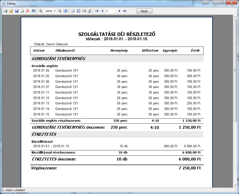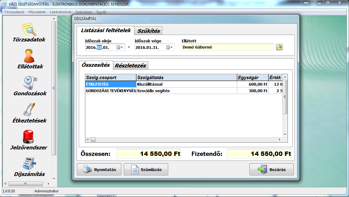 • Térítési díjak pontos számítása az egyéni jövedelemkorlátok figyelembe vételével, díjszámítási részletező nyomtatásával, valamint szükség esetén számla készítési lehetőséggel